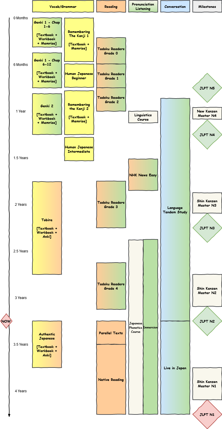 When I first started studying Japanese I had my past failures in mind. At learning French, and all the other endeavors - novel writing, tennis, basket weaving - which had been picked up for a few months and then discarded. I knew that it would be much easier to stick to Japanese if a) I made it fun, b) I made measurable progress along the way1 and c) I knew how long it would take. So I tried to approach it like a typical engineer and created a plan with milestones and progress checks along the way. I broke down the language into discrete sub skills (reading, listening, speaking, pronunciation, etc) with individual study plans for each.
