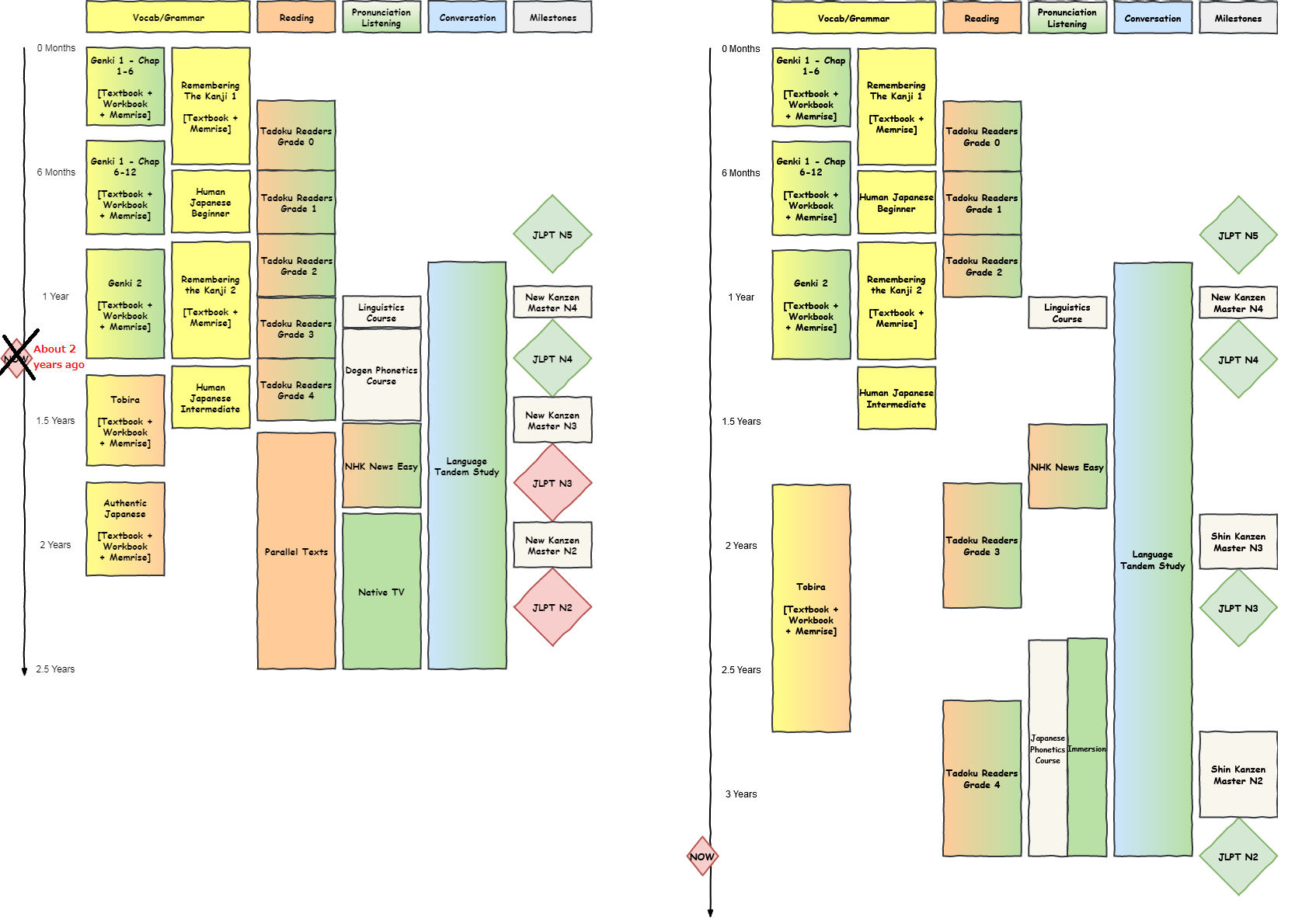 In the 12 month update, I planned to attempt the JLPT N2 after 2.5 years - the second highest Japanese language qualification, and the one that is often asked for by employers. As it happened, I passed the N2 just this last December after 3 years and change. So I'm about 6 months behind my goal. That's a failure on paper, but I consider it a success considering that two years ago I was basically picking numbers out of a hat. Here's the plan I outlined then, vs what actually happened: